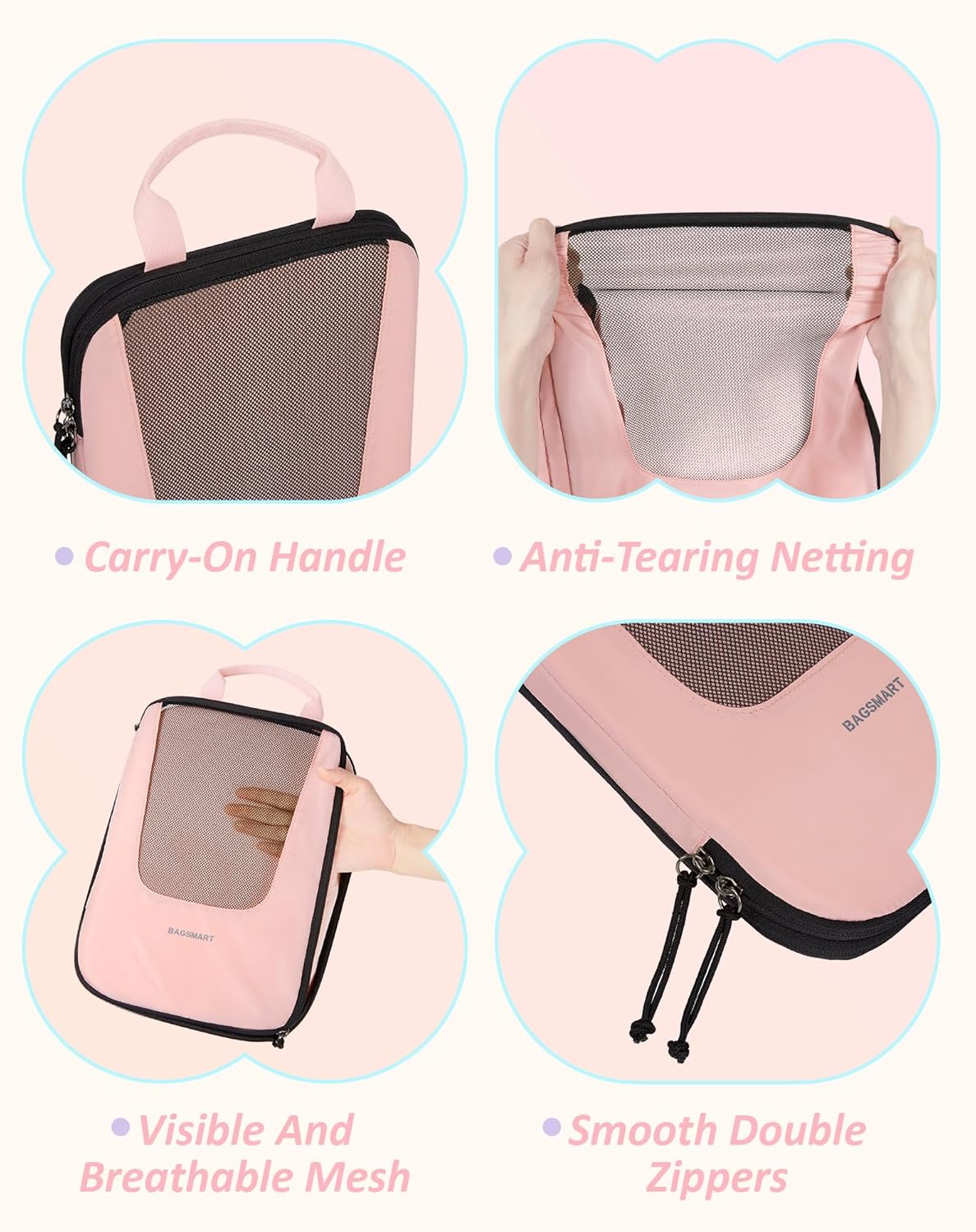 With our innovative compression technology, these packing cubes maximize space in your suitcase, allowing you to pack more while staying organized. The double zippers and mesh panels provide easy access to your belongings, while the built-in handles make for convenient carrying.